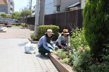 5月27日(月)午前、PTA施設・保健委員会のみなさんが、グラウンド入り口にある花壇、プランターの花を植え替えてくださいました。