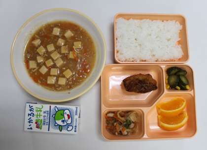 5月29日(水) 給食の献立は、マーボー丼、赤魚の中華風味揚げ、鶏肉と野菜のオイスターソース炒め、きゅうりとコーンの中華あえ、オレンジ、牛乳でした。
