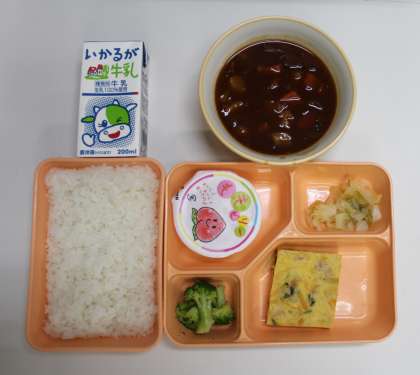 5月31日(金) 給食の献立は、ビーフシチュー(ブロッコリー入り)、スペイン風オムレツ、キャベツのピクルス、桃ゼリー、米飯、牛乳でした。