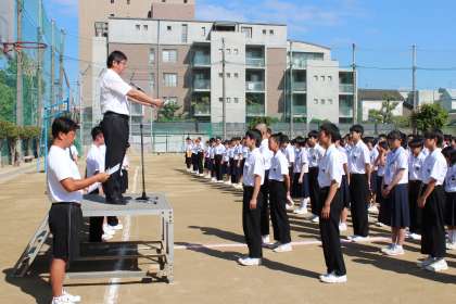 6月3日(月)朝、全校集会で、卓球部男子が6月1日(土)開催された大阪市中学校春季総合体育大会決勝で、上宮中学校と対戦し、惜しくも連覇ならず準優勝し、代表生徒に校長先生から表彰状が授与され、生徒全員から大きな拍手で祝福されました。