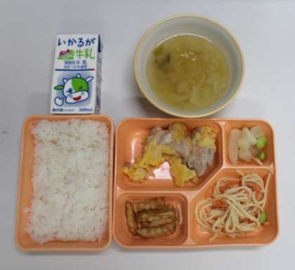 6月3日(月) 給食の献立は、チキンピカタ、たらこスパゲッティ、フライドポテト、だいこんと枝豆のサラダ、スープ、米飯、牛乳でした。