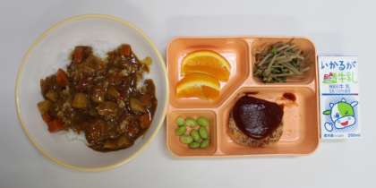 6月5日(水) 給食の献立は、チキンカレーライス、枝豆、とうふハンバーグ、ごぼうサラダ、オレンジ、牛乳でした。