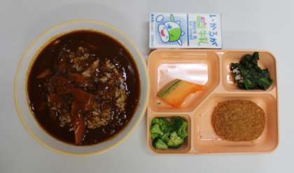 6月12日(水) 給食の献立は、ポークハヤシライス、ブロッコリー、野菜コロッケ、ベーコンとほうれん草のソテー、クインシーメロン、牛乳でした。