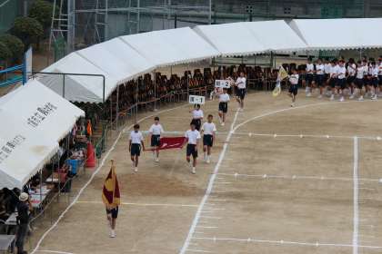 いよいよ入場行進が始まりました。先頭の生徒会役員が校旗を持って入場しています。