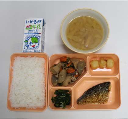 6月14日(金) 給食の献立は、鯖の塩焼き、筑前煮、揚げポテトもち、ほうれん草のおひたし、みそ汁、米飯、牛乳でした。