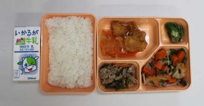 6月18日(火) 給食の献立は、鶏肉の南蛮漬け、ちくわと野菜の煮もの、なすのしょうがじょうゆ炒め、オクラのおひたし、米飯、牛乳でした。