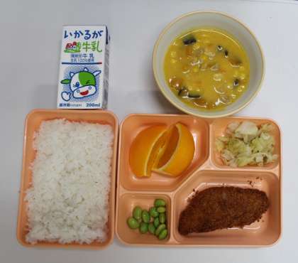 6月19日(水) 給食の献立は、かぼちゃのクリームシチュー(枝豆)、白身魚フライ、キャベツのピクルス、オレンジ、米飯、牛乳でした。