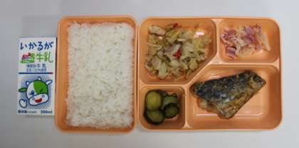 6月20日(木) 給食の献立は、さごしのムニエル、鶏肉と野菜のソテー、ジャーマンポテト、きゅうりのサラダ、米飯、牛乳でした。