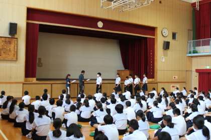 集会では、体育大会学年種目「大玉運び」で男女別上位3クラス、総合上位3クラスの代表生徒が島原学年主任から表彰状が授与され、、生徒全員から大きな拍手で祝福されました。