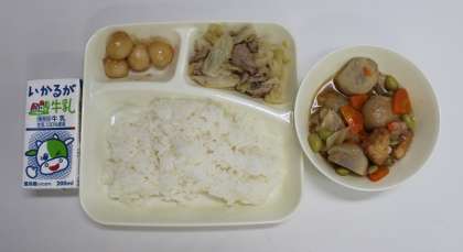 9月11日(水) 給食の献立は、「月見の行事献立」となっていて、豚肉とキャベツのいためもの、鶏肉とさといもの煮もの、みたらしだんご、ごはん、牛乳でした。