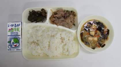 9月25日(水) 給食の献立は、豚肉の甘辛焼き、オクラのおかかいため、みそ汁、ごはん、牛乳でした。