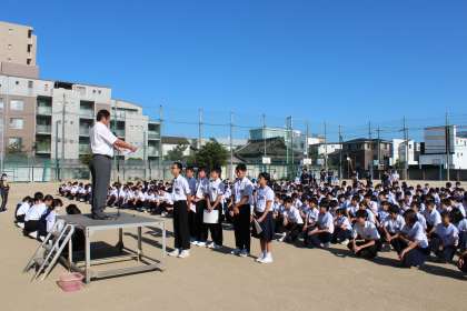 10月7日(月)朝、全校集会で、9月16日(祝)府立天王寺高校で開催された阿倍野区中学生親善ソフトボール大会に出場したチーム「さわやか+」(野球部の3年生主体チーム)のみなさんが準優勝し、校長先生から表彰状が授与され、全校生徒から大きな拍手で祝福されました。おめでとうございます!