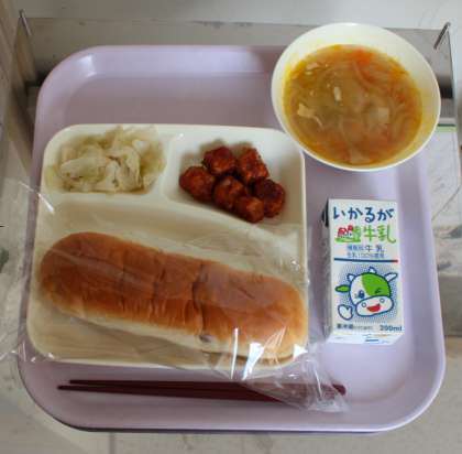 10月10日(木) 給食の献立は、まぐろのオーロラ煮、ベーコンとじゃがいものスープ、キャベツのゆずドレッシング、パン、牛乳でした。