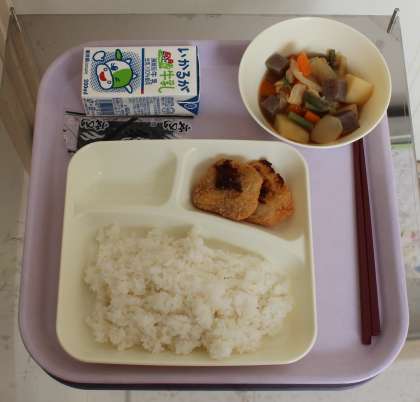 10月15日(火) 給食の献立は、みそかつ、じゃがいもと野菜の煮もの、焼きのり、ごはん、牛乳でした。