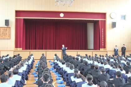 戦国最強と言われた信玄が最も大切にしたことは何か。信玄の言葉に「人は城、人は石垣、人は堀、情けは味方、仇は敵なり」というものがあります。最終的に大切なの人だと言っています。周りの人を大切にすることが、これから受験に向かう大切な時期だからこそ、みんなを助けてくれることになるのではないかと思いますと、お話がありました。