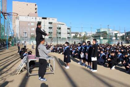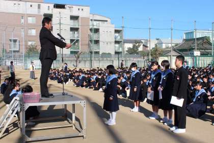 夏休みの「理科の自由研究」の代表作品に選ばれた生徒、その中で「優良賞」に選ばれた生徒が、校長先生から表彰状が授与され、生徒全員から大きな拍手で祝福されました。