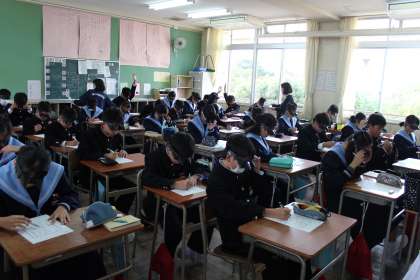 「車いす体験」、「手話」、「ロービジョン」を通じて、「障がいのある人を理解し、自分たちがすべきことを考え行動する力をつけさせること」を目的にしています。「手話」では、「阪南中学校」、中島みゆきの歌「糸」を指文字で表現することを学びました。