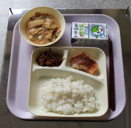 11月11日(月) 給食の献立は、あかうおのしょうゆだれかけ、きんぴらごぼう、みそ汁、ごはん、牛乳でした。