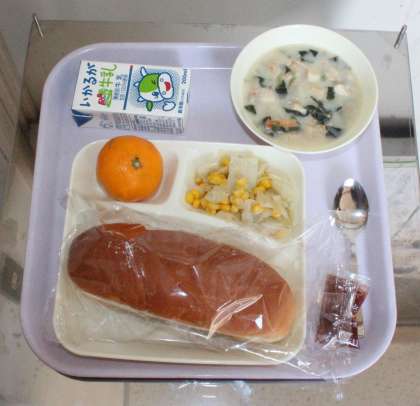 11月12日(火) 給食の献立は、ほたて貝のクリームシチュー、キャベツとコーンのサラダ、みかん、いちごジャム、パン、牛乳でした。