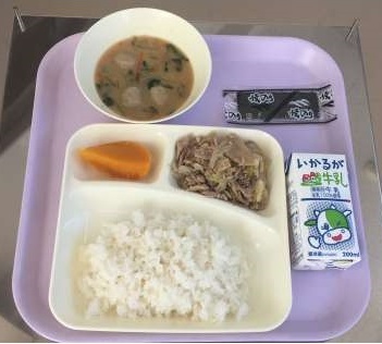 11月13日(水) 給食の献立は、豚肉とまいたけのいためもの、つみれ汁、かぼちゃのういろう、焼きのり、ごはん、牛乳でした。