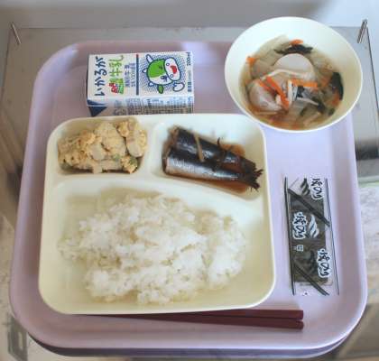 12月5日(木) 給食の献立は、いわしのしょうが煮、うすくず汁、高野どうふの卵とじ、焼きのり、ごはん、牛乳でした。