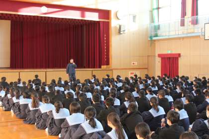 集会では、長阪先生から…クラブの時や教室では「あいさつ」ができていると思いますが、先日家庭訪問の途中、出会った生徒がフードを深くかぶりすれ違っていったことがありました。はずかしさがあるのかもしれないが、とても残念でした。気持ちよく「あいさつ」できるようになってほしいと、お話がありました。