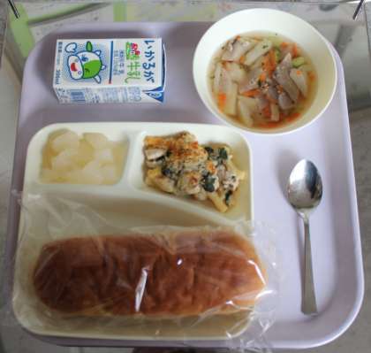 1月8日(水) 給食の献立は、マカロニグラタン、だいこんのスープ、和なし、パン、牛乳でした。