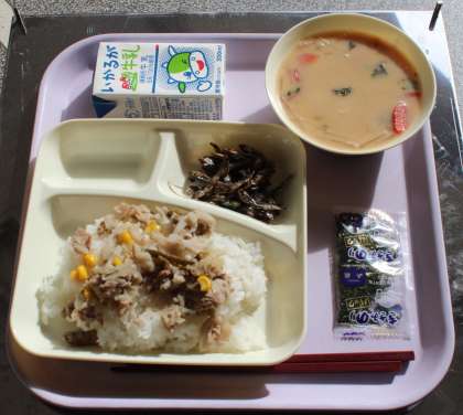 1月9日(木) 給食の献立は、れんこんのちらしずし、ぞう煮、ごまめ、牛乳でした。