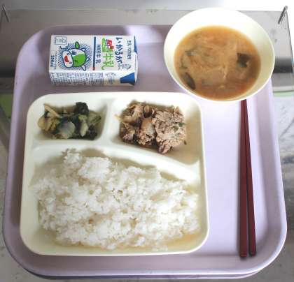 1月16日(木) 給食の献立は、豚肉のごまだれ焼き、きくなとはくさいのおひたし、みそ汁、ごはん、牛乳でした。