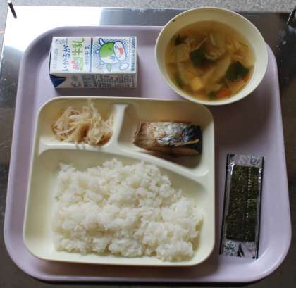 1月17日(金) 給食の献立は、さばのみそ煮、すまし汁、もやしのゆずの香あえ、焼きのり、ごはん、牛乳でした。