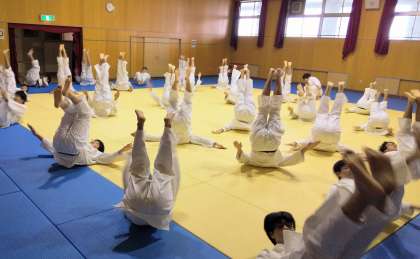 体育の授業で、柔道に取り組んでいます。まずは基本の受け身です。
