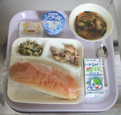 1月22日(水) 給食の献立は、鶏肉のオイスターソース焼き、えびととうふのスープ、チンゲンサイのピリ辛あえ、ヨーグルト、パン、マーマレード、牛乳でした。