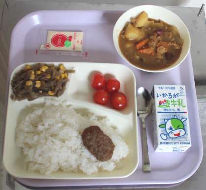 1月24日(金) 給食の献立は、豚肉と金時豆のカレーライス、焼きハンバーグ、ごぼうサラダ、プチトマト、牛乳でした。