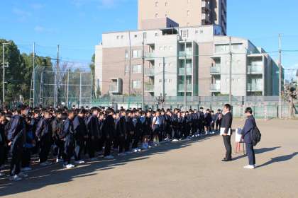 続いて、2年体育委員のAくんは、急な大役に抜擢され「阪中健児の歌」をリードして歌いました。