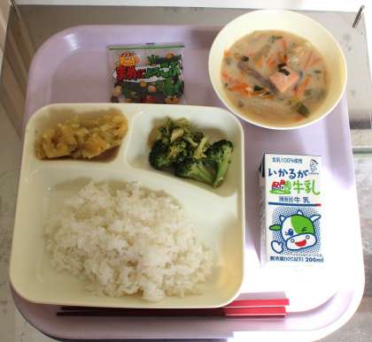 1月30日(木) 給食の献立は、かす汁、ブロッコリーのしょうがづけ、くりきんとん、豆こんぶ、ごはん、牛乳でした。