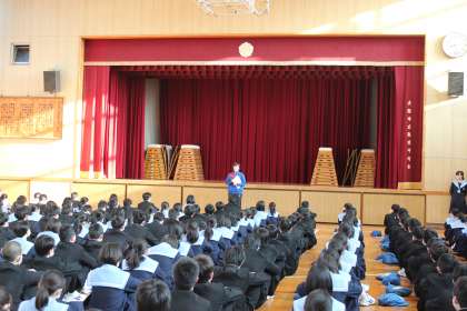 集会では、黒木先生から…私は、何もかもよくできる方ではなかったので、人の良いところを見習い、努力をしてきました。人は、一人では生きていけません。困ったときに相談できる人、支えてくれる人が必要です。今みなさんは、高校入試前で勉強がんばっていると思いますが、みなさんの周りには応援してくれる家族、友だちがいます。感謝の気持ちを持ち、中学校生活を最後までやり切ってほしいと、お話がありました。