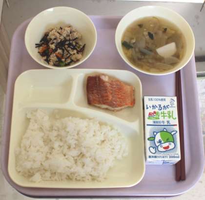2月6日(木) 給食の献立は、あかうおのしょうゆだれかけ、うすくず汁、高野どうふのいり煮、ごはん、牛乳でした。