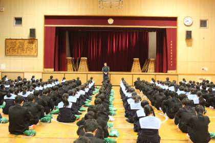集会では、宇治先生から…義務教育が1年あまりで終わり、いよいよ進路選択になります。自ら考え判断して行動し、行動に責任をもつことになります。高校入試、大学入試、就職と節目があり、先生は大学入試に失敗した経験があります。何度か挫折したことがありますが、夢や希望を持ち続けてきました。みなさんも挫折することがあるかもしれませんがあきらめず、夢や希望を持ち続けてほしいと、お話がありました。