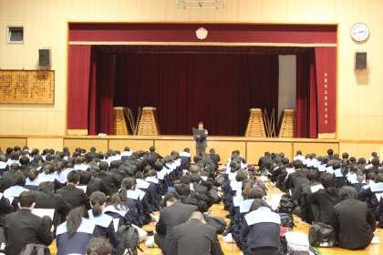 進路指導主事の坂口先生から…「前日の注意」として、持ち物、確認事項、服装について説明を行い、続いて「当日の注意」として、不測の事態なったときの対応について、落ち着いて中学校へ連絡するように。受験にあたっての心構えや答案作成のテクニックのお話がありました。