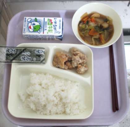 2月7日(金) 給食の献立は、鶏肉のからあげ、まる天と野菜のうま煮、焼きのり、ごはん、牛乳でした。