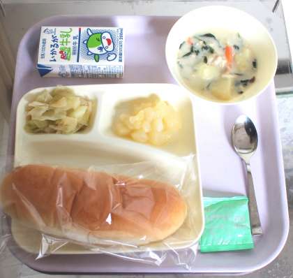 2月10日(月) 給食の献立が、ほうれんそうのクリームシチュー、キャベツのサラダ、洋なし、パン、りんごジャム、牛乳でした。