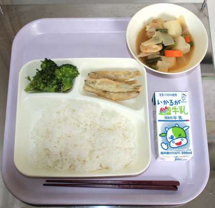 2月14日(金) 給食の献立は、一口がんもとじゃがいもの煮もの、きびなごのてんぷら、ブロッコリーのごまあえ、ごはん、牛乳でした。