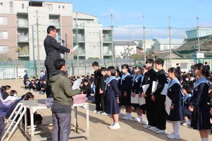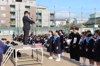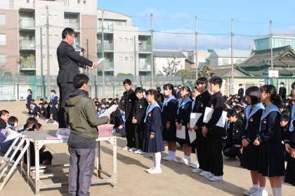大阪市中学校体育連盟第8支部冬季大会で、1年生シングルスの部で、優勝したSさん、準優勝Nさん、3位Fさん、Mさん及びダブルスの部で準優勝したTさんFさんペアが、校長先生から表彰状が授与され全校生徒から大きな拍手で祝福されました。おめでとうございます!