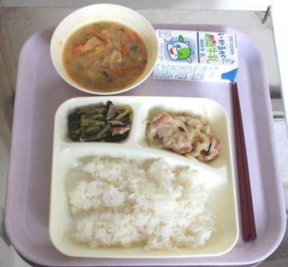 2月27日(木) 給食の献立は、さつまいものみそ汁、こまつなの煮びたし、鶏肉のゆず塩焼き、ごはん、牛乳でした。