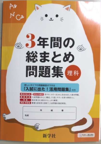 理科の「3年間の総まとめ問題集」には、「総まとめノート」が付属されていませんので、臨時休業中の課題は、総まとめ問題集に 直接書き込み をしてください。
