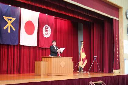 おそらく皆さんの家族にもこの阪南中学校の卒業生であるという人はたくさんいるでしょう。そう、おじいさん、おばあさんからお父さんお母さん、そしてお兄さんやお姉さんからバトンをつないできていよいよ皆さんの出番です。皆さんの母校であるこの阪南中学校の伝統を守りつつ、あらたな伝統への積み上げを誇りを胸に持ち続け、がんばってください。