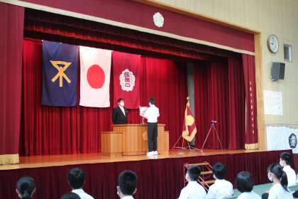 新入生を代表して、Tくんから、中学校はいろんな面で小学校とは違いますが、一生懸命頑張りたい。時には悩み、立ち止まってしまう時もあると思います。そんな時は、自分たちで力合わせて乗り越えていこうと思います。もしそれでも解決できないできないときは、先輩方、先生方、保護者の皆様にお力をお貸しください。最後に阪南中学校の生徒としての誇りを持ち、実りある中学校生活を送りたいと、誓いのことばがありました。