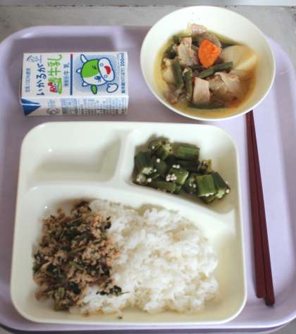 7月3日(金)給食の献立は、豚肉とじゃがいもの煮もの、オクラの梅風味、ツナっ葉いため、米飯、牛乳でした。