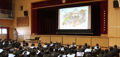 1年生は、2限に体育館で防災研修を受けました。阿倍野区役所 安全安心まちづくり担当の方に来ていただき、大規模地震による災害の備えについて話を聞きました。