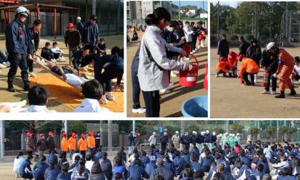 2年生は、2限に運動場で防災訓練を実施しました。阿倍野消防署の方々の他、地域から防災リーダー・女性防火クラブの方々に来ていただきました。3つのグループに分かれて、可搬式ポンプの操作や初期消火訓練、身近なものを使った応急処置について指導をいただきました。